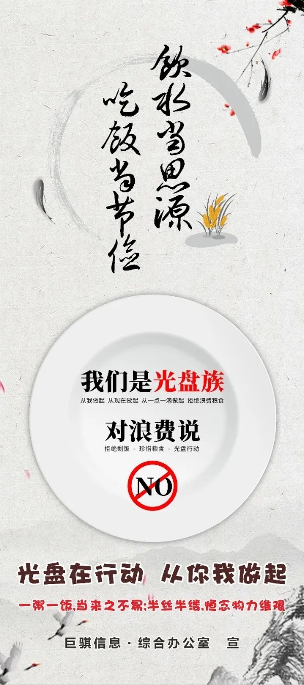 有一種節(jié)約叫光盤,有一種公益叫光盤。為熱烈響應(yīng)習(xí)近平總書記 對(duì)制止餐飲浪費(fèi)行為作出的重要指示,進(jìn)一步弘揚(yáng)中華民族勤儉節(jié)約的美德,8月18日開(kāi)始,巨騏信息“文明餐桌,光盤行動(dòng)”系列活動(dòng)正式啟動(dòng)。“一粥一飯,當(dāng)思來(lái)之不易;半絲半縷,恒念物力維艱”。一個(gè)國(guó)家、一個(gè)民族對(duì)節(jié)儉和浪費(fèi)的態(tài)度,折射出其價(jià)值標(biāo)準(zhǔn)和文明程度。只有讓勤儉節(jié)約風(fēng)氣在全社會(huì)成為深入人心的理念,轉(zhuǎn)化為人們的具體行動(dòng)、社會(huì)風(fēng)尚。每一粒糧食都值得被珍惜,讓我們一起加入“光盤行動(dòng)”的行列,堅(jiān)決拒絕“舌尖上的浪費(fèi)”,爭(zhēng)做節(jié)儉風(fēng)尚的傳播者、實(shí)踐者、示范者。